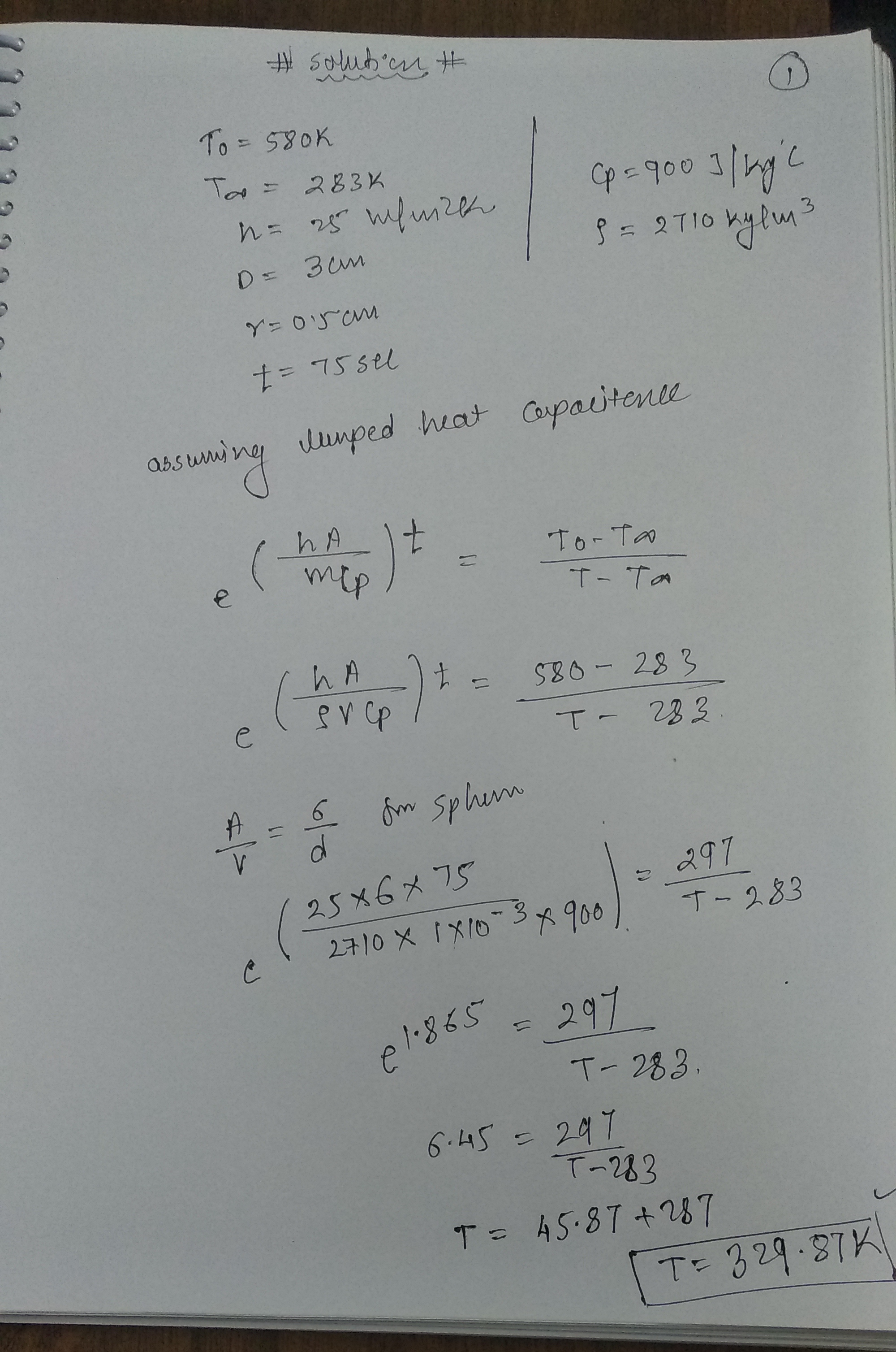 Aluminum balls are heated up to 580 K and then exposed to air at 283 K to cool down with an average heat transfer coefficient of 25 W/m2·K. The balls are 3 cm in diameter. Find the temperature at r = 0.5 cm after 75 seconds of exposure. Is the lumped capacitance an acceptable solution here? [Ans.: 329 K].