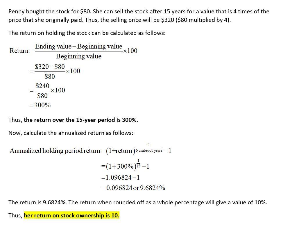question archive If Penny bought a stock for $80 dollars and could sell it 15 years later for 4 times what she originally paid, what is Penny’s return on owning this stock? (Enter your answer as a whole percentage (e