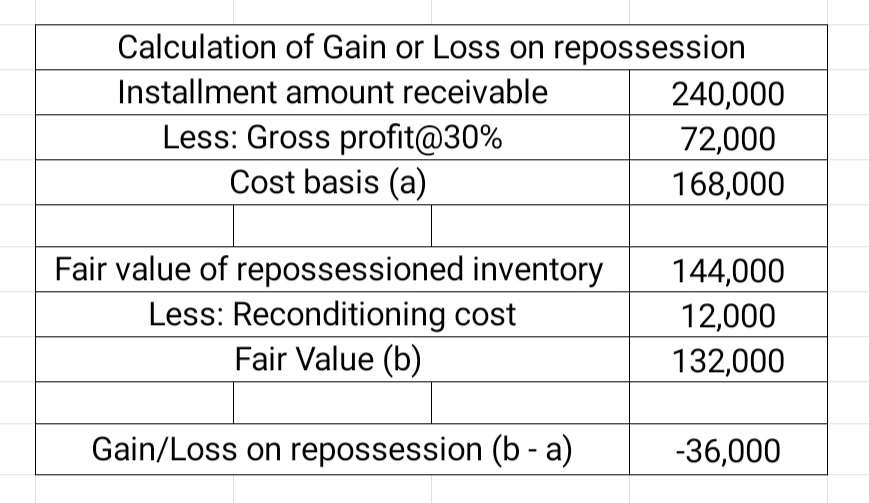 ABC Company. uses instalment sales method Of accounting. During the year, a buyer defaulted on an instalment sale leaving ABC Co with no other choice but to repossess the inventory sold. As of the date repossession, the following data are available: