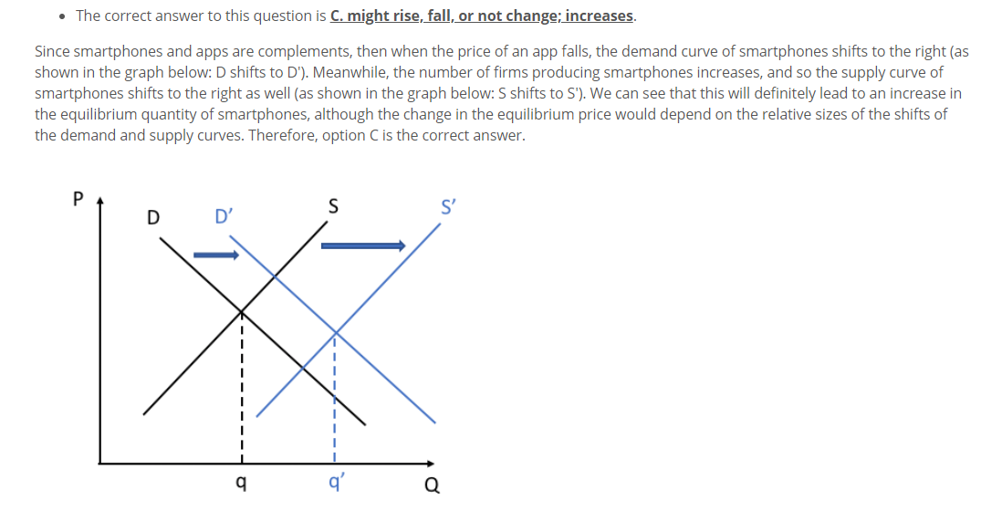 Smartphones and apps are complements and the price of an app falls. Simultaneously, the number of firms producing smartphones increases. As a result, the equilibrium price of a smartphone _____ and the equilibrium quantity _____.