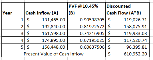 Find the profitability index (PI) for the following series of future cash flows, assuming the company's cost of capital is 10.45 percent. The initial outlay is $438,216.