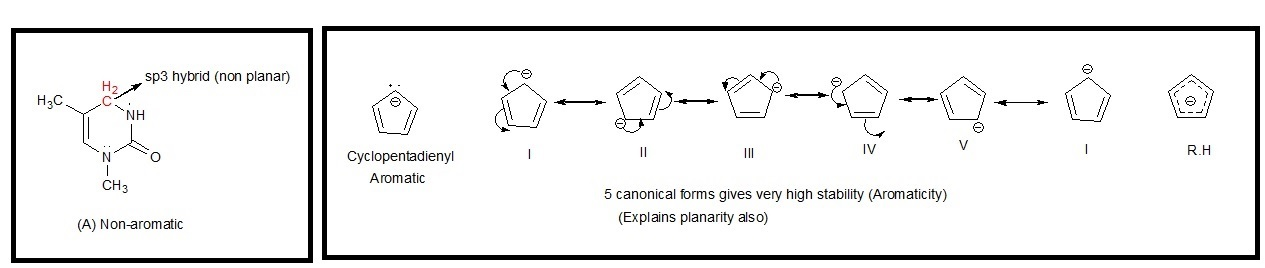In (B) –It’s a cyclic 5 C system 4 C which are doubly bonded are sp2 hybridized (4 pi electrons) and 1 C a carbanion which though sp3 hybridised but as conjugates its lone pair of electron in pi electron system gets planarity. Also 4 pi electrons + 2 electrons in –ve charge on carbanion makes total of 6 electrons i.e [4n+2] electrons (n = 1 makes it =4 x1 + 2 = 6 pi electrons). Hence The cyclopentadinyl anion is a Cyclic, highly conjugated, Planar structure with [4n+2] pi electrons system and thus is Aromatic by Huckel’s rule.