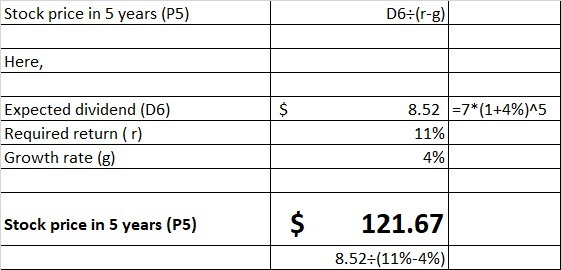 Long Life Floors is expected to pay an annual dividend of $7 a share and plans on increasing future dividends by 4 percent annually. The discount rate is 11 percent. What will the value of this stock be 5 years from today (in $ dollars)? $_