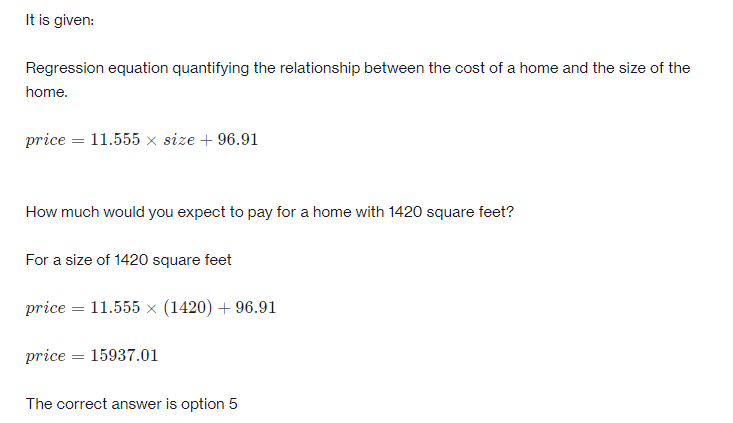 Question 7 (1 point) Suppose that in a certain neighborhood, the cost of a home (in thousands) is proportional to the size of the home in square feet. If the regression equation quantifying this relationship is found to be (price) = 11.155*(size) + 96.91, how much would you expect to pay for a home with 1420 square feet? 1) 137623.35 ( 2) 15840.1 ( 3) We do not know the observations in the data set, so we cannot answer that question. ( 4) 118.61 5) 15937.01