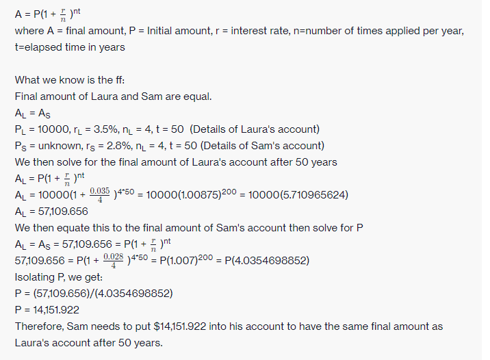 Laura deposits $10000 in a CD account at 3.5% interest compounded quarterly. Her friend, Sam, wants to put in a smaller amount of money so that his account will equal hers in 50 years, yet his interest rate is only 2.8% interest (compounded quarterly). How much money does he need to put into his account so that they have the same amount of money?