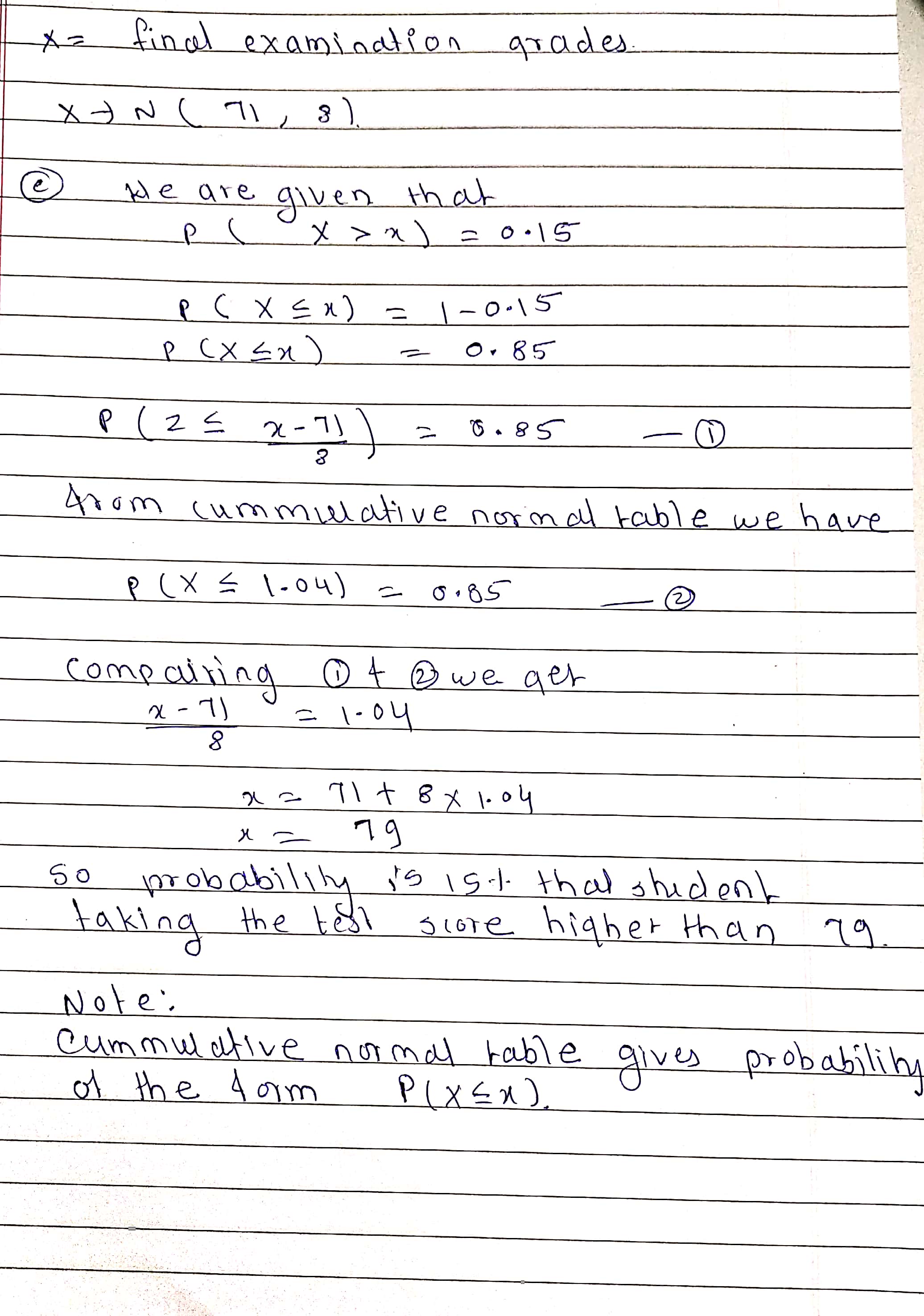c. The probability is 15?% that a student taking the test scores higher than what? grade?
