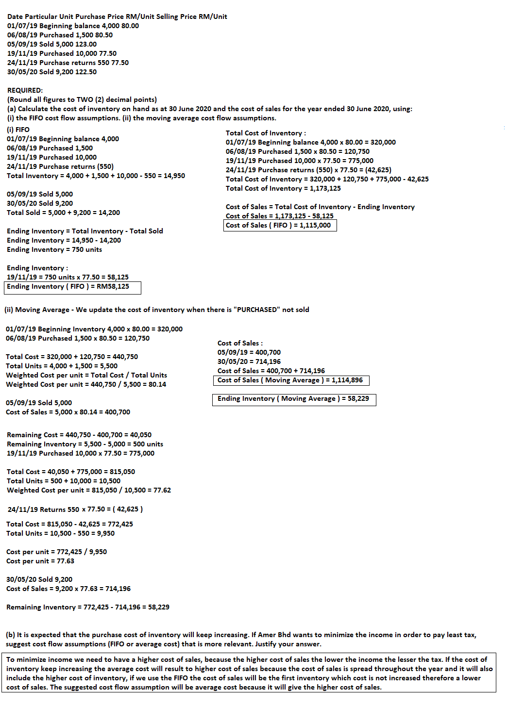 (b) It is expected that the purchase cost of inventory will keep increasing. If Amer Bhd wants to minimize the income in order to pay least tax, suggest cost flow assumptions (FIFO or average cost) that is more relevant. Justify your answer.