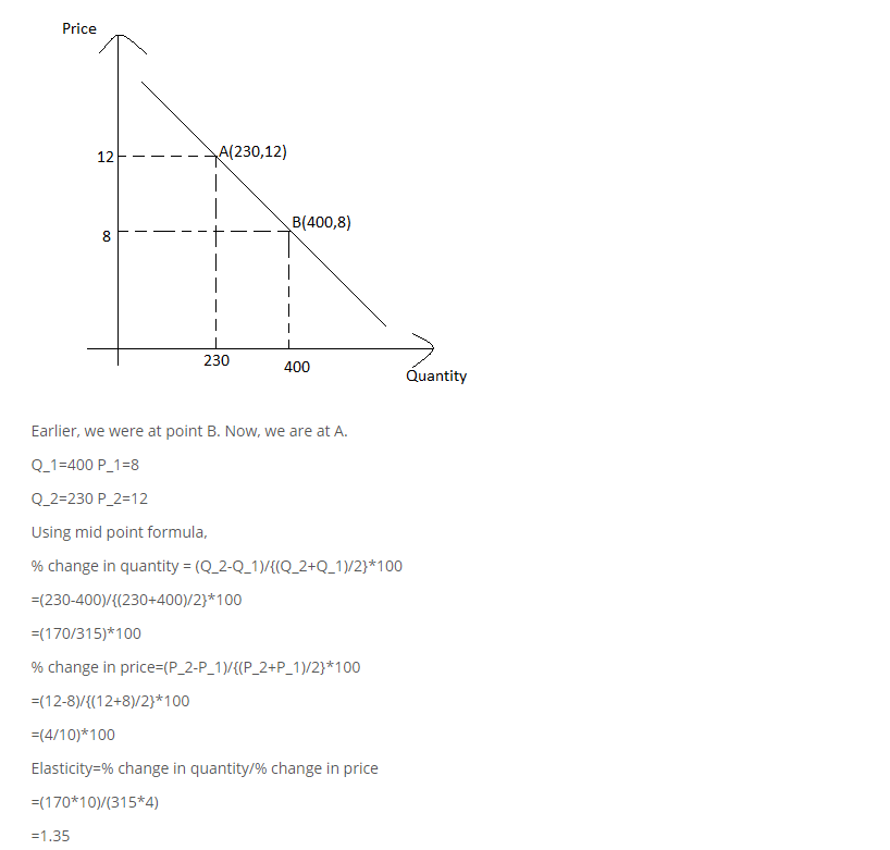When the price of a certain chemical was $8 per pound, customers in this area were willing to buy 400 pounds per day. Now that the price has risen to $12 per pound, they are only willing to buy 230 per day. Estimate the price elasticity of demand in this area for this chemical to at least two decimal places.