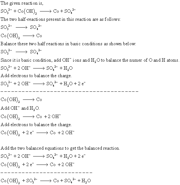 Balance the following equation in basic conditions. Phases are optional. SO3 2- + Co(OH)2 yields Co + SO4 2-