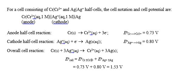 question archive What is the net cell reaction for the chromium-silver voltaic cell? Cr(s) --> Cr^3+(aq) + 3e Ag+(aq) + e --> Ag(s)