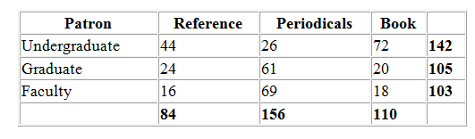 The university's library has been randomly surveying patrons over the last month to see who is using the library and what services they have been using. Patrons are classified as undergraduate, graduate, or faculty. Services are classified as reference, periodicals, or books. The data for 350 people are given below. Assume a patron uses only one service per visit.
